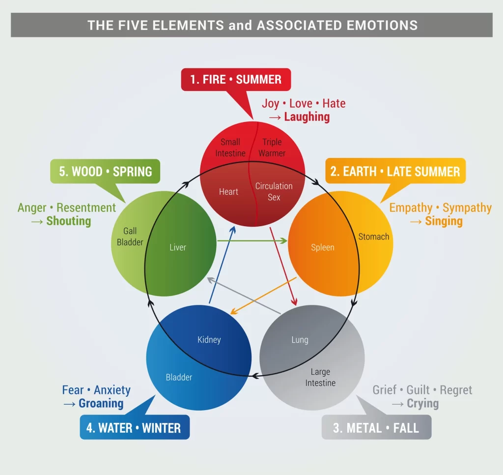 In the typical Eastern medicine concept, we believe that the 5 Yin organs (Spleen, Liver, Kidneys, Heart, and Lungs) and the 6 Yang organs (Stomach, Gallbladder, Bladder, Small Intestine, Large Intestine, and Triple Warmer) produce 7 emotional energies: Anger, Sadness, Grief, Fear, Anxiety, Surprise, and Joy. (Depending on the chart, there may be slightly different information presented.)
